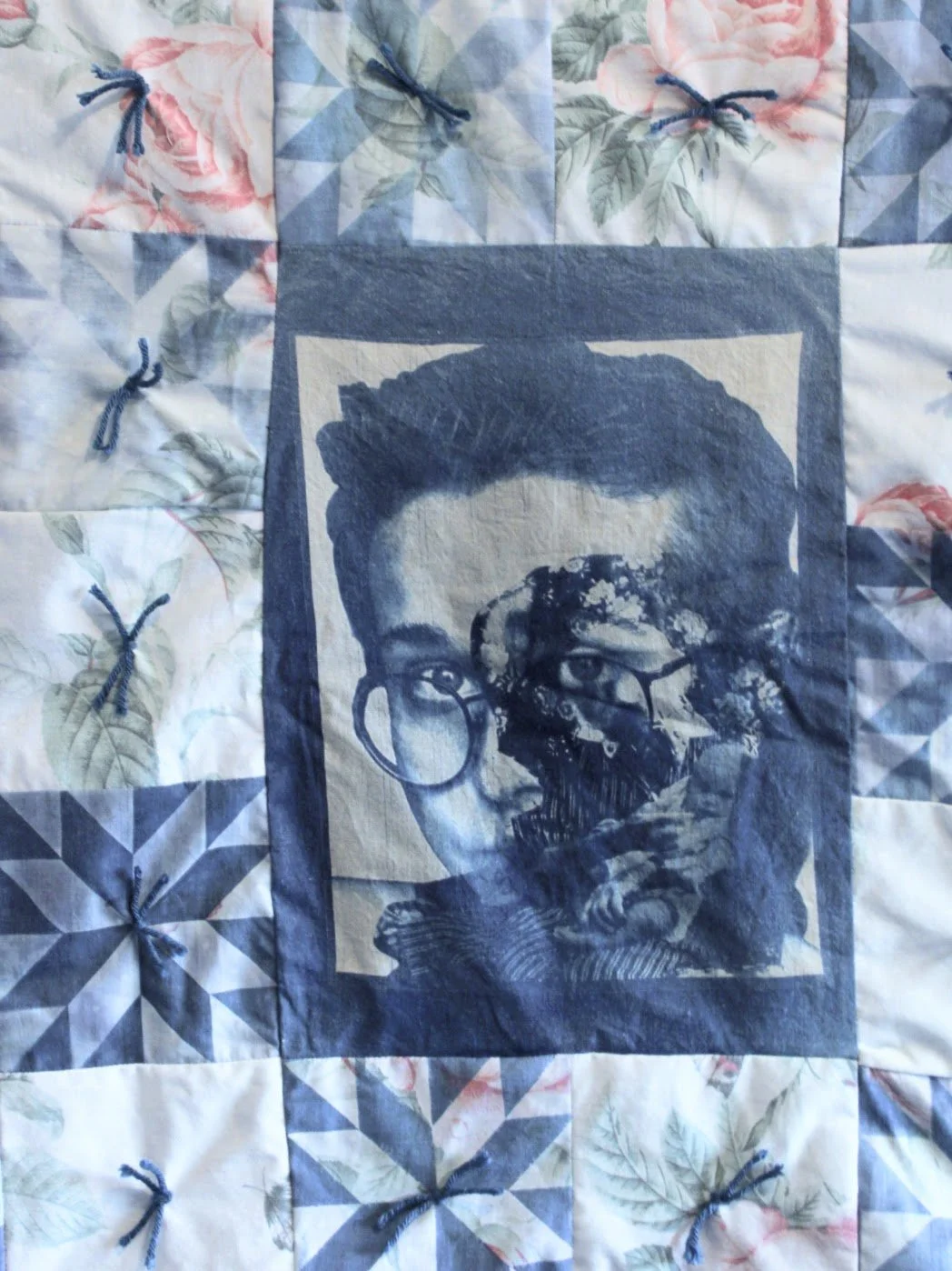 The images in this artwork are self-portraits with images of my family covering my face. Showing the desire I have to follow in my parents footsteps. A quilt and two button up shirts are my canvas. Both acting as symbols of my parents. Printing these images using the method of cyanotype, creates an image that is not fully developed. The color is monochromatic and because of this something is missing. I feel something is missing within my parents and I's relationship. The feeling that I will never fully be what my parents want.